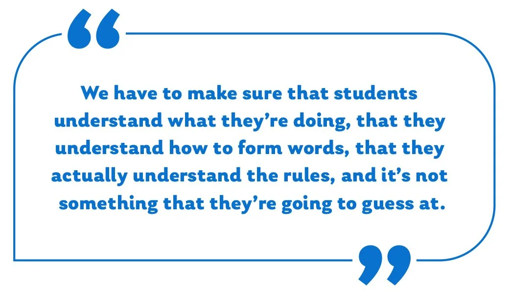 Though this research has been around for decades, in many classrooms techniques based on the belief that reading is a “natural” process have lingered. For example, some teachers were taught to encourage children to guess an unfamiliar word based on a picture or the context instead of sounding it out—skipping the crucial step that trains the brain to link the letters with the sounds. With the evidence-based approach, Olds-Pearson says, “We have to make sure that [students] understand what they’re doing, that they understand how to form words, that they actually understand the rules, and it’s not something that they’re going to guess at.”