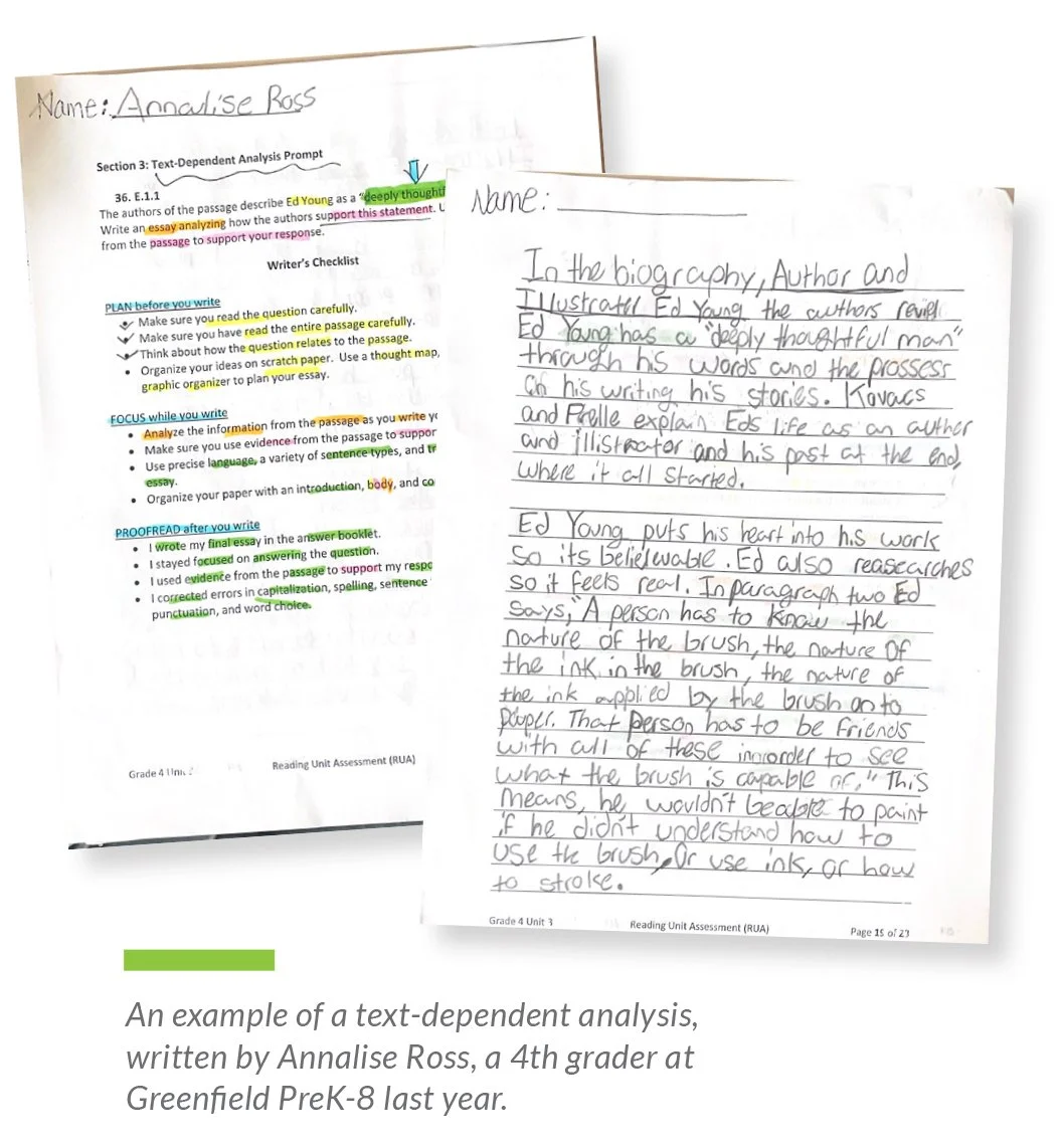 One of the biggest shifts she sees between 3rd and 4th grade is in the amount of writing, and the forms of writing, students are expected to do. Writing is a skill of its own, but it’s also a way to coax meaning from a text, and to show that the writer understood what they read. To meet Pennsylvania’s core standards for ELA, King’s students must write what’s known as a “text-dependent analysis,” which is tested for the first time on the 4th grade PSSA.